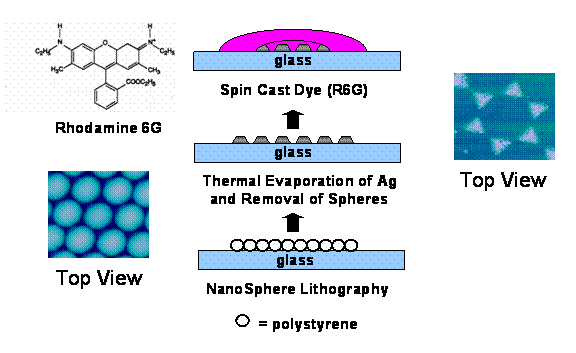 A monolayer of polystyrene spheres are is formed on a cleaned (Piranha:RCA) glass cover slip by slowly withdrawing it from a 1% aqueous suspension of nanospheres (Interfacial Dynamics, Alkjdadl, OR). The spheres order in a hexagonal closed packed structure in micron to tens of micron sized regions. Silver is then evaporated onto the sample and the spheres removed by sonication in ethanol. Triangles of silver are formed where silver deposited on the glass slide through the interstitial regions of the hexagonal closed packed spheres. Before examining the surface enhancing properties of these silver films, ~ 50 mL of Rhodamine 6G (1 mM in Methanol) is spun-cast onto the sample.