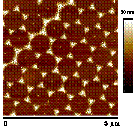 Both sphere masks and Ag triangle films are characterized by atomic force microscopy (AFM). The image below is a 5 x 5 ?m AFM image showing Ag triangles 30 nm tall.